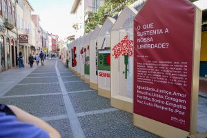 A anteceder a apresentação da exposição “Linhas com Liberdade”, na Rua 1.º de Dezembro, em Esposende, ouviram-se, novamente, canções de abril, pelas vozes de uma das classes de conjunto vocal do 3.º ciclo do Ensino Articulado da Escola de Música de Música de Esposende, dirigida pelo Professor Ernesto Clemente. Esta mostra resulta da Oficina de Instalação de Arte Urbana do Projeto AMAReMAR – Arte e Comunidade, orientada pela artista Ana da Silva, que enquadrou e fez a apresentação dos trabalhos. Tendo por mote e inspiração os acontecimentos que desabrocharam na madrugada de 25 de abril de 1974, esta criação, referiu, foi concebida com recurso à técnica de bordado com linhas de lã e resulta de uma reflexão sobre o conceito e desejo de liberdade(s).